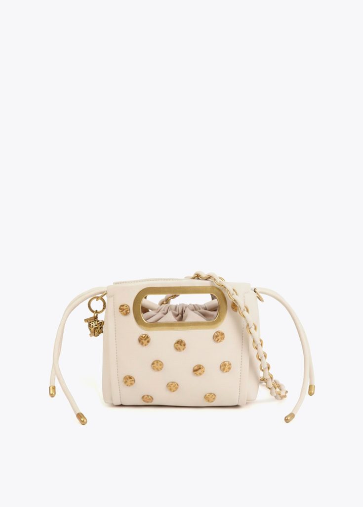 Elegante bolso bandolera con textura y decorado con tachas doradas. Asa ajustable y cierre magnético para mayor seguridad. Bolsillo interno para organización y detalle de charm metálico en el lateral.