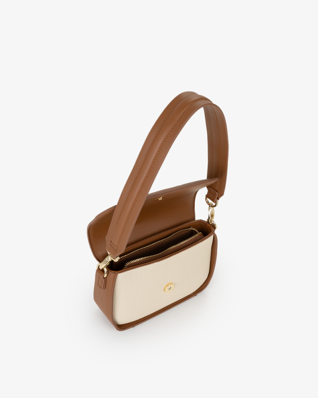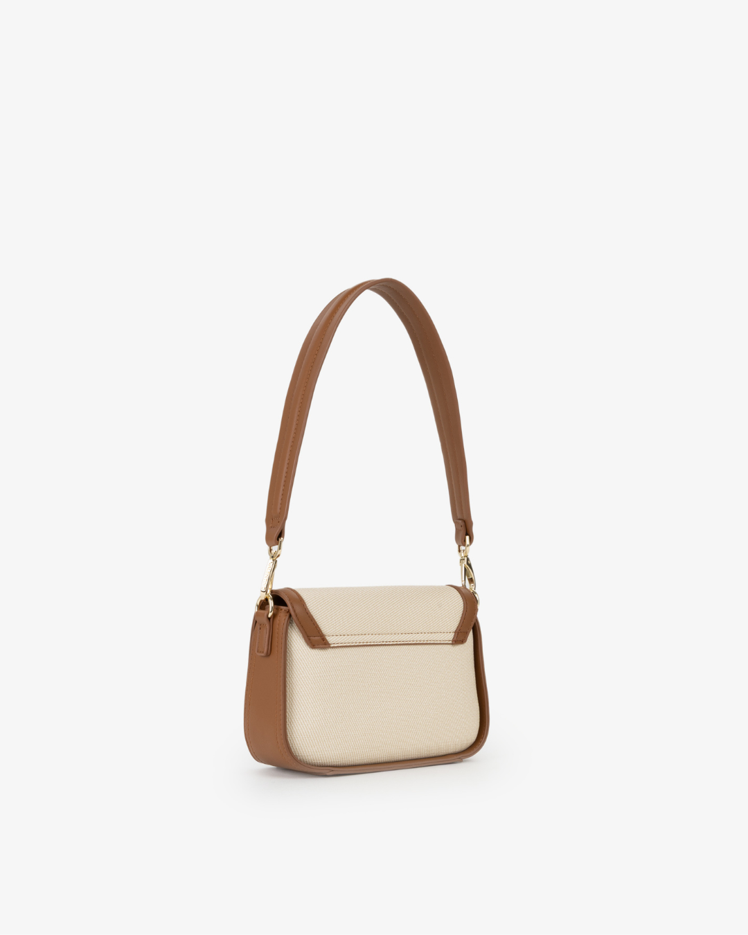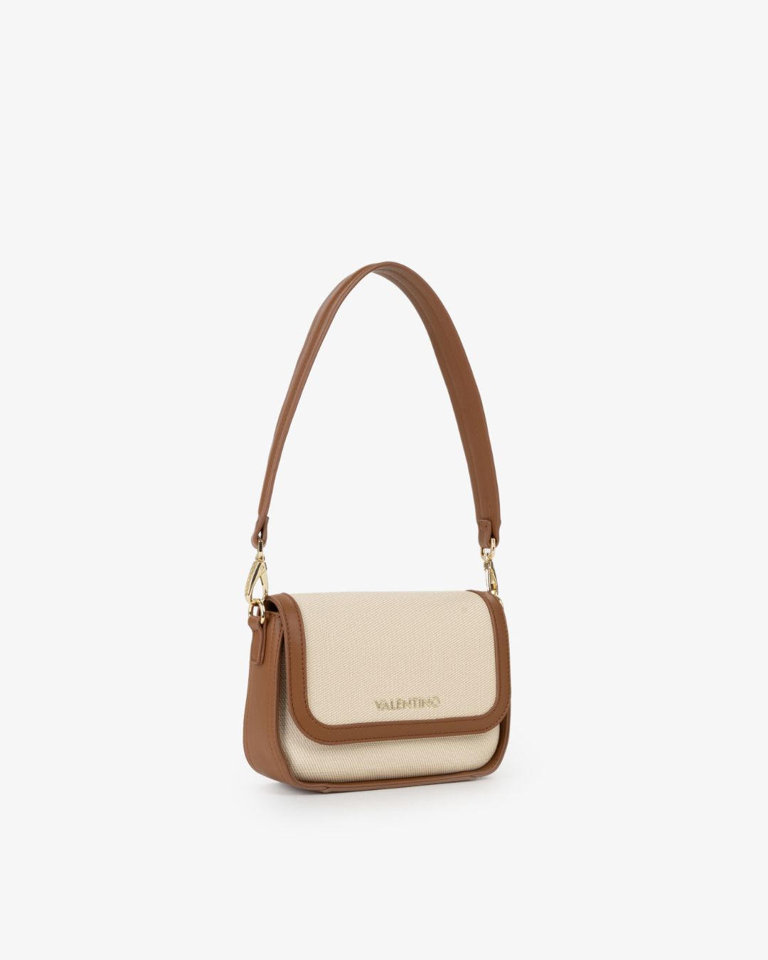 Bandolera Valentino en color beige con terminaciones en marrón. Con bandolera para cruzar y correa corta para hombro.