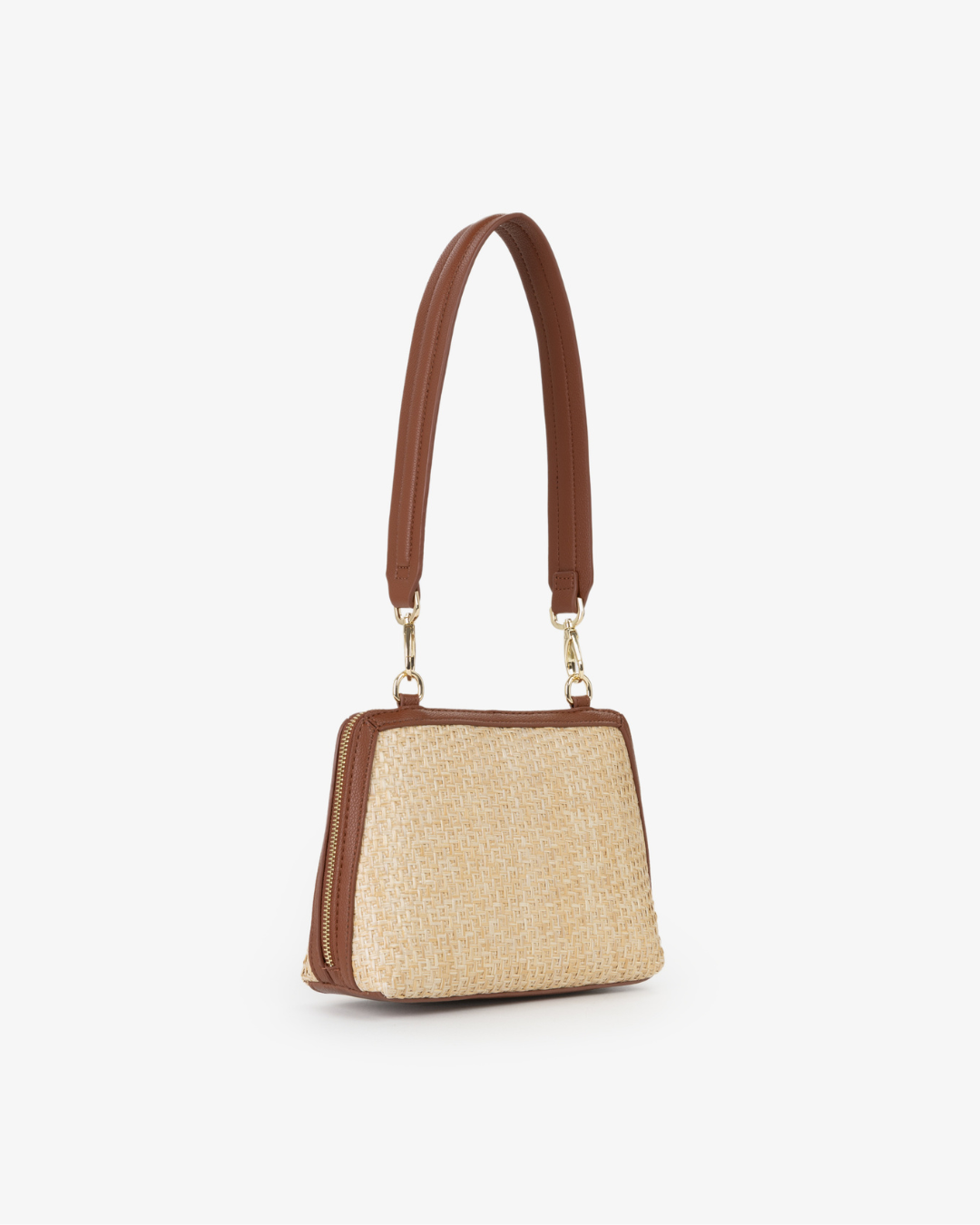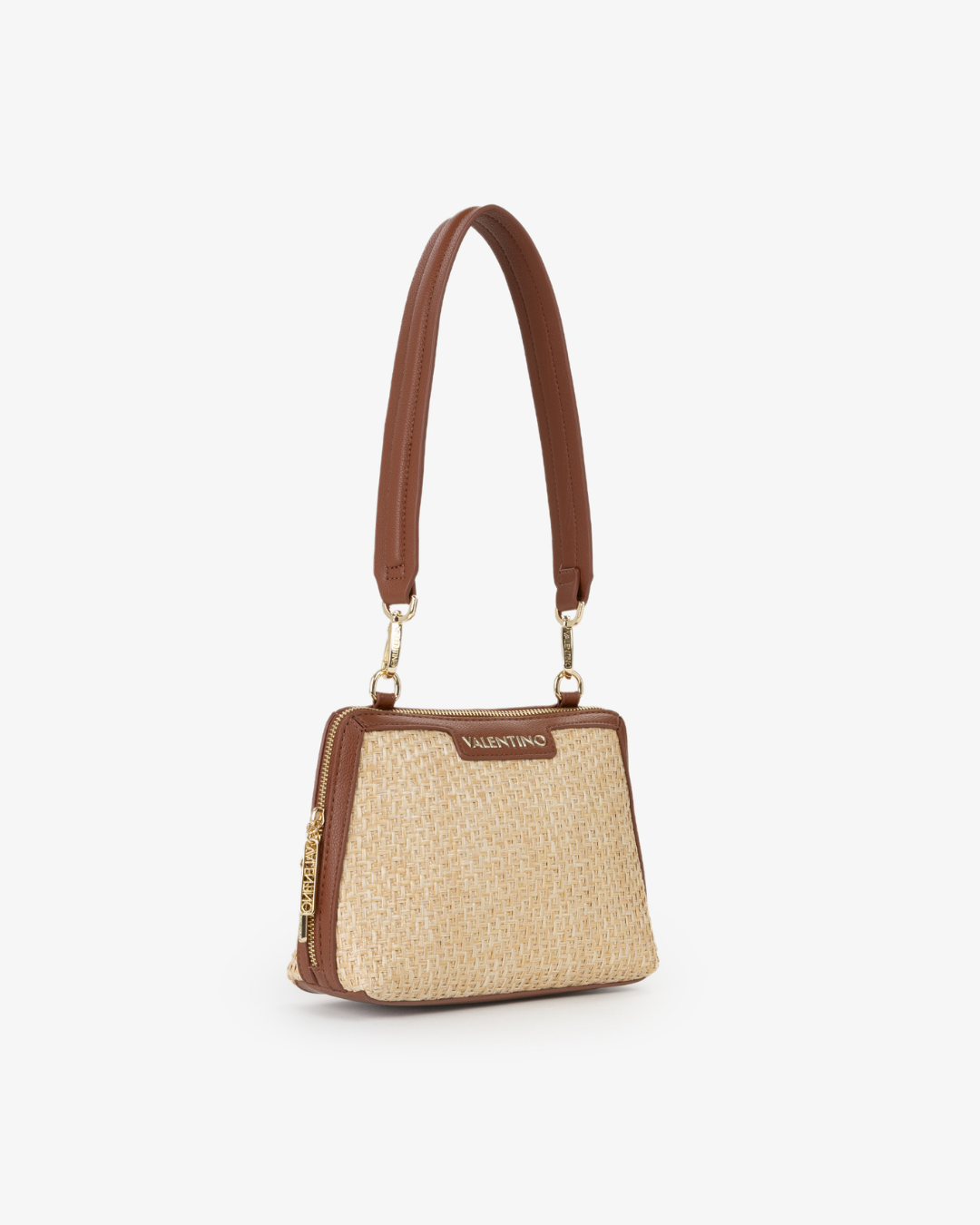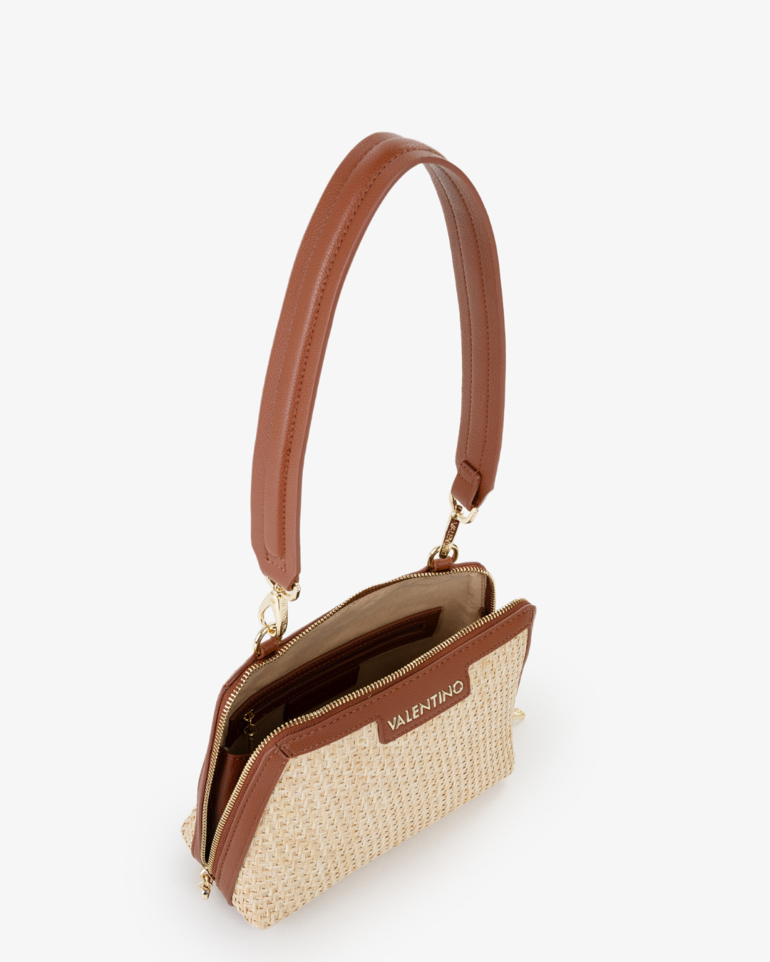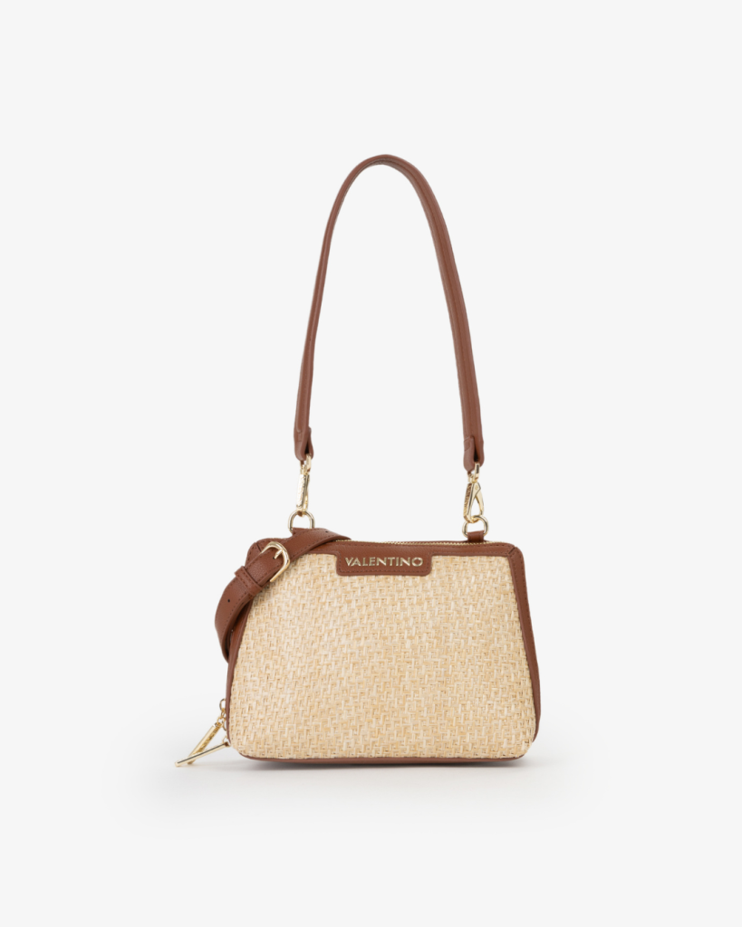 Bolso Valentino de rafia natural con terminaciones en color cuero. Con bandolera para cruzar y correa para hombro.