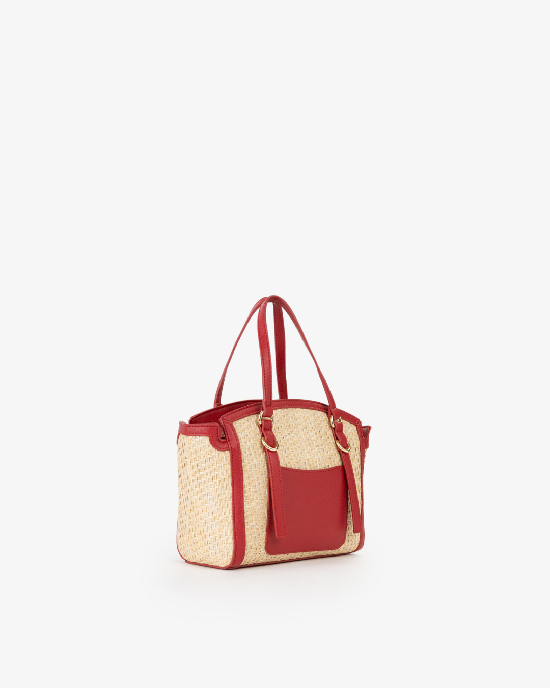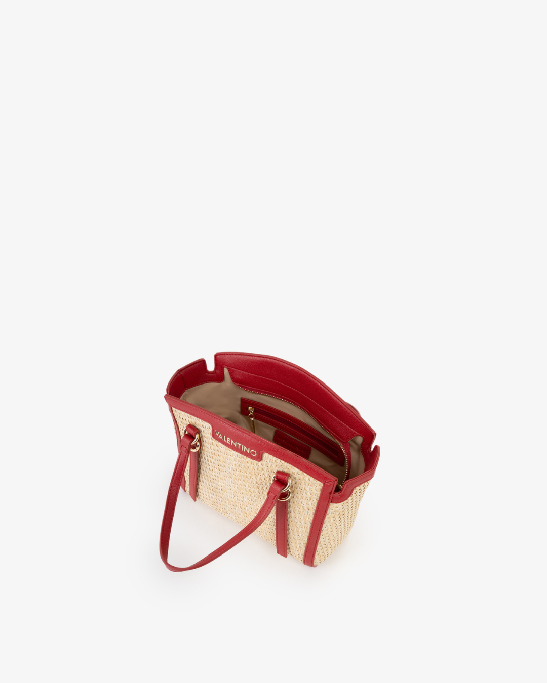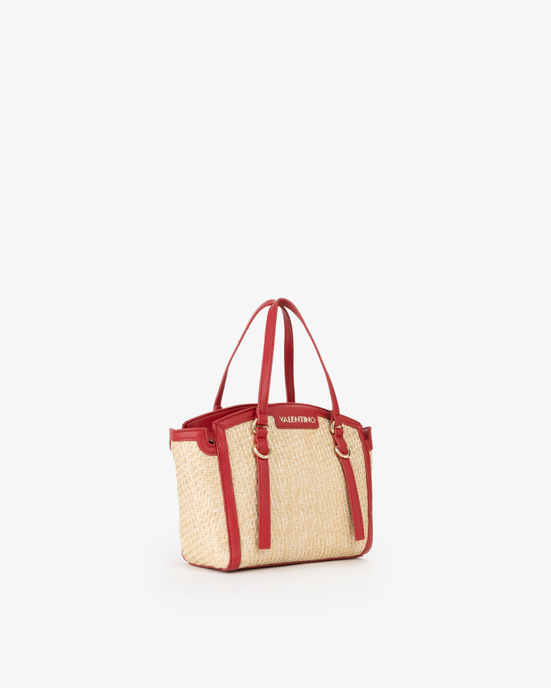 Bolso de mano Valentino de rafia y terminaciones en rojo.