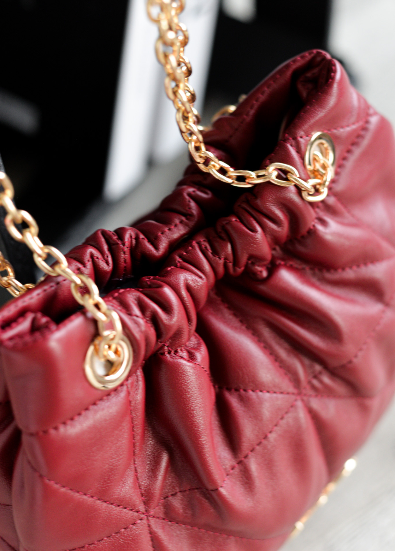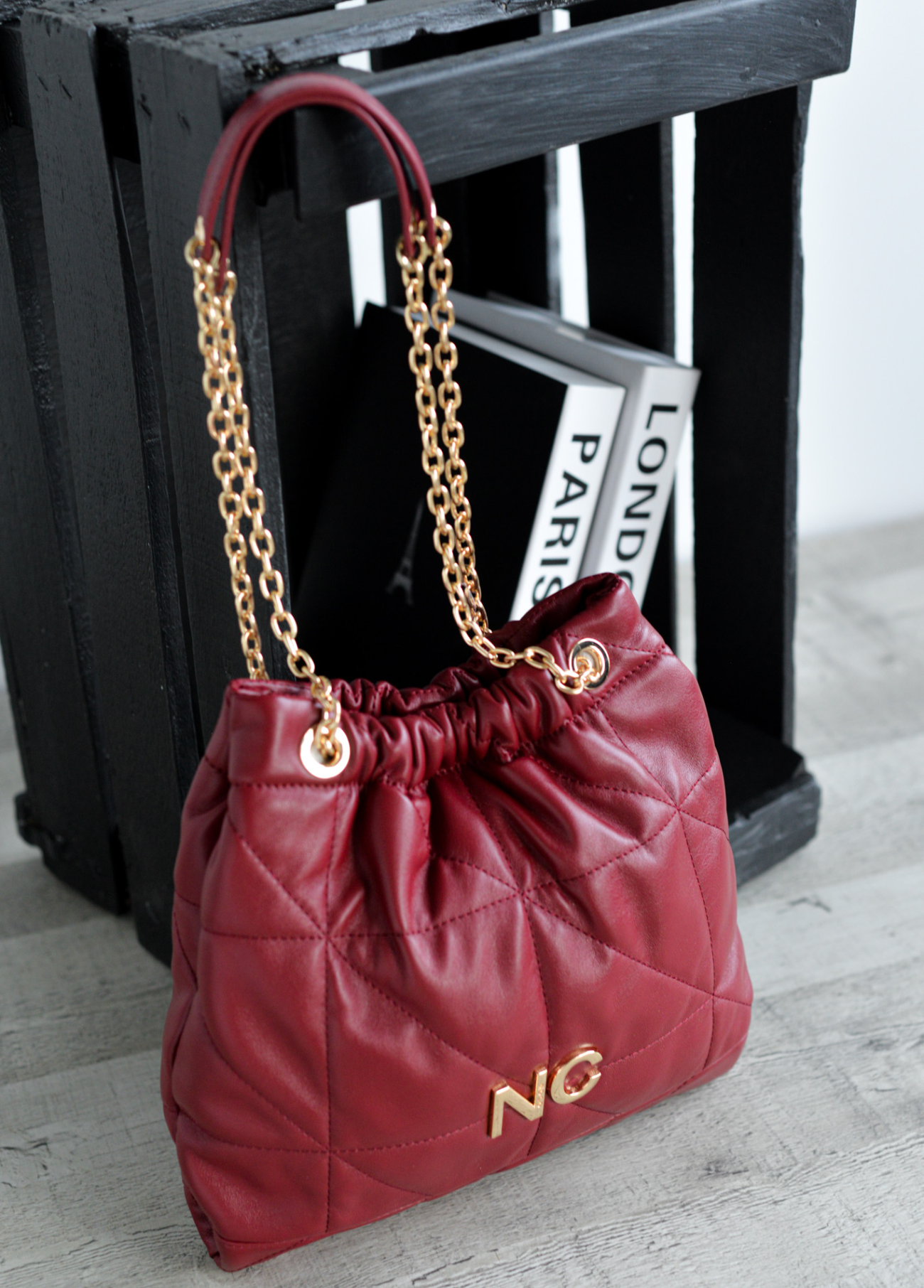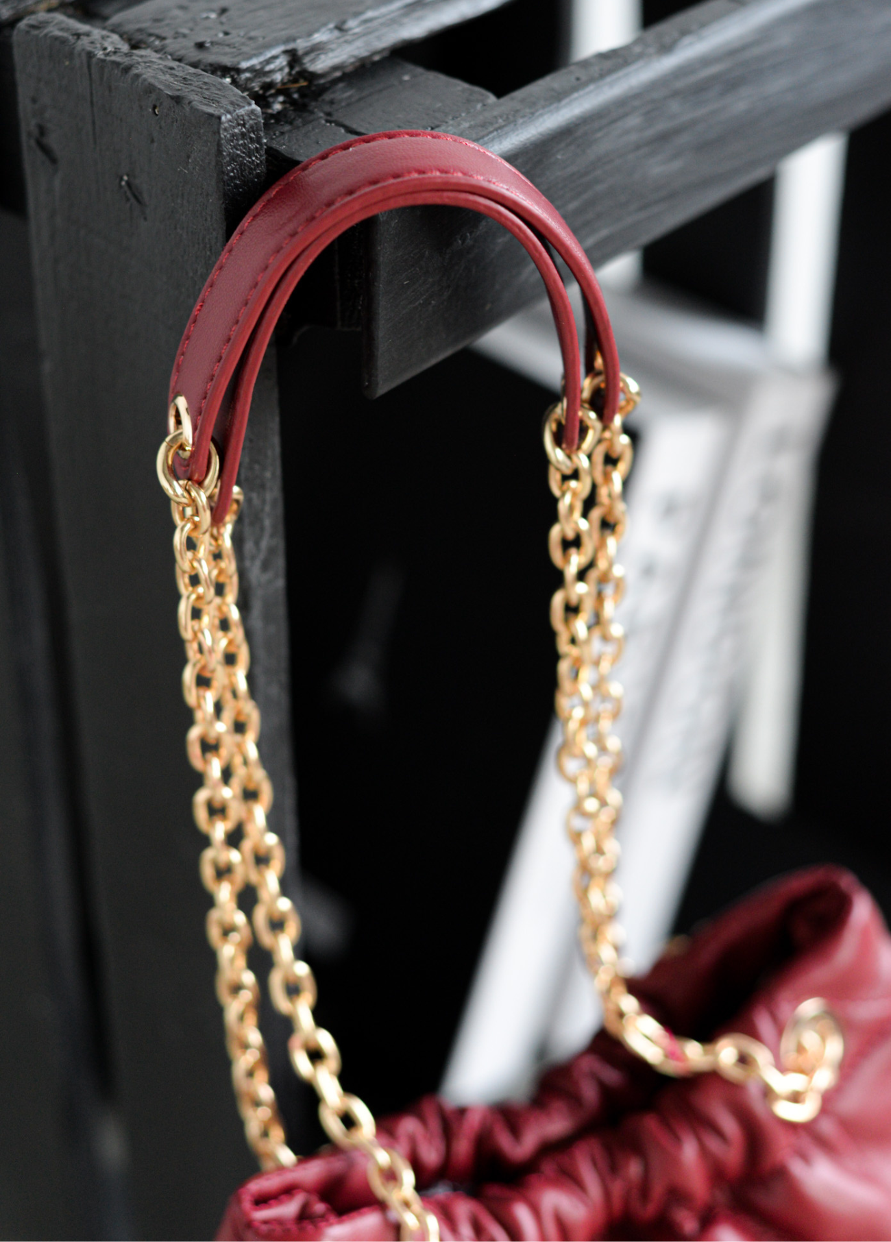Sus cadenas largas doradas, complementadas con el clásico detalle de aplique en piel para el hombro, ofrecen un uso cómodo y estiloso, perfecto para quienes buscan un accesorio diferente y práctico.
